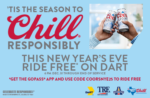 Use the GoPass mobile ticketing app and the special promo code to the right to ride TRE free of charge New Year’s Eve after 6 p.m.