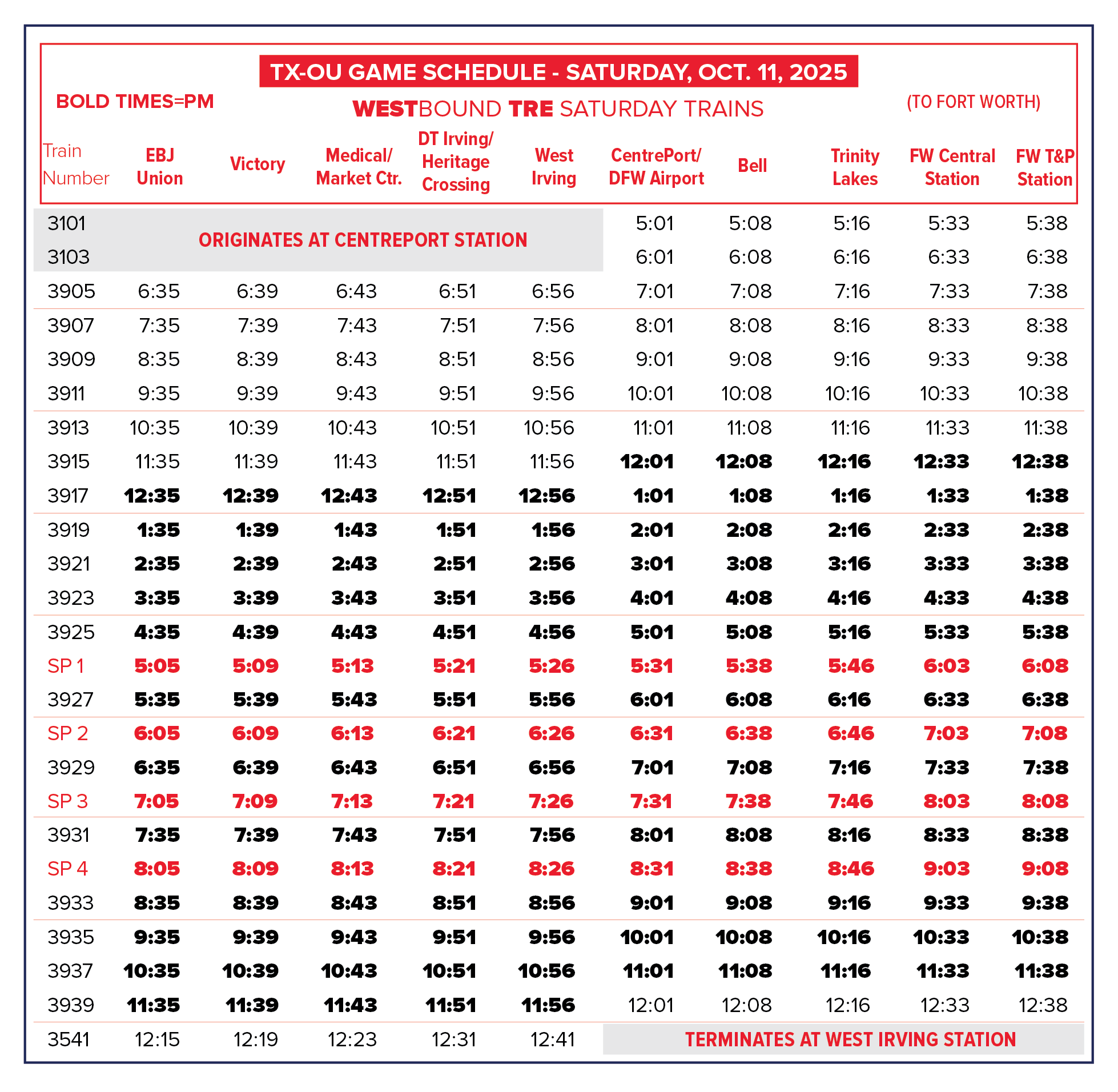 — Saturday, Oct. 11: TRE will offer special 30-minute frequency on westbound trains immediately following the TX-OU game. Please consult the schedule in the drop-down box below.