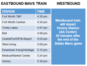Dallas Stars and Dallas Mavericks: A westbound train will depart Victory Station (AA Center) 20 minutes after the end of ALL Dallas Stars and Dallas Mavericks games that begin after 6:00 p.m., Monday – Saturday. These trains will be noted on the events schedule below with this designation: (+20)