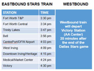 Dallas Stars and Dallas Mavericks: A westbound train will depart Victory Station (AA Center) 20 minutes after the end of ALL Dallas Stars and Dallas Mavericks games that begin after 6:00 p.m., Monday – Saturday. These trains will be noted on the events schedule below with this designation: (+20)